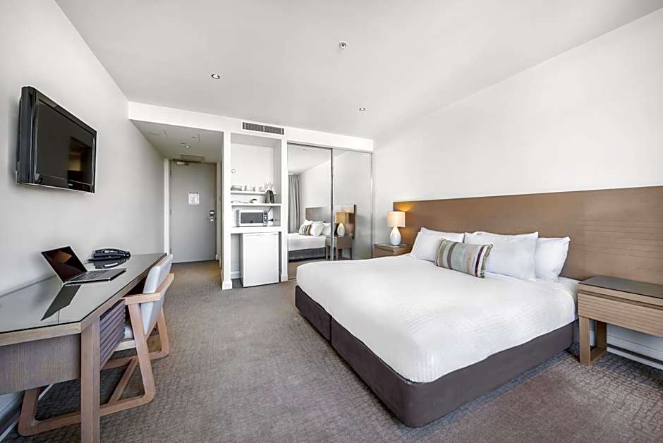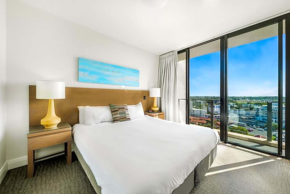 This spacious apartment features a wide private balcony, 3 bathrooms, a fully equipped kitchen and laundry facilities. This unit is a combination of a two-bedroom apartment and a Hotel Room with interconnecting access.